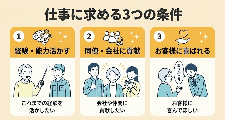 65歳を超えた方が、仕事選びの際に大切にしていることは何でしょうか。こちらでは、日本公庫総研レポート「働くシニア世代、支える中小企業」の調査から、65歳以上の方が仕事に働きがいを感じる3つの条件を紹介します。