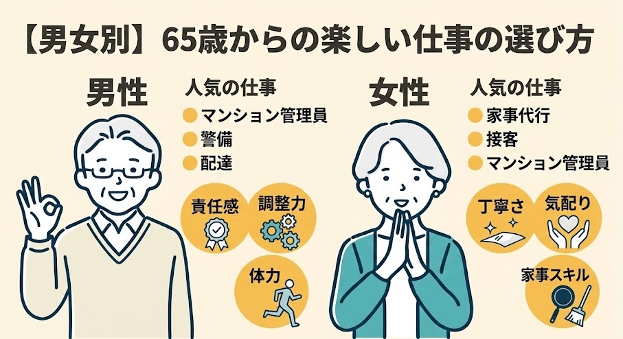 マンション管理員、清掃、接客・販売、家事代行、介護補助などが人気です。いずれも体力的な負担が少なく、短時間勤務が可能で、人との交流がある仕事です。本記事の「65歳からの楽しい仕事おすすめ10選」で、各仕事の特徴や勤務条件を詳しく紹介しています。