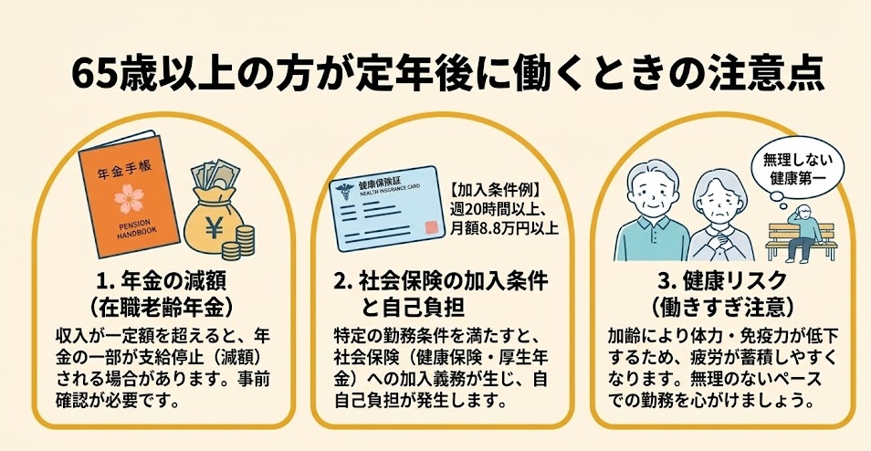 厚生年金に加入しながら働く場合、賃金と年金の月額合計が50万円(令和6年度基準)を超えると年金が一部減額されます。ただし、週2〜3日・短時間勤務であれば多くの場合は減額の対象外です。詳しくは本記事の「65歳以上が働くときの注意点」をご覧ください。